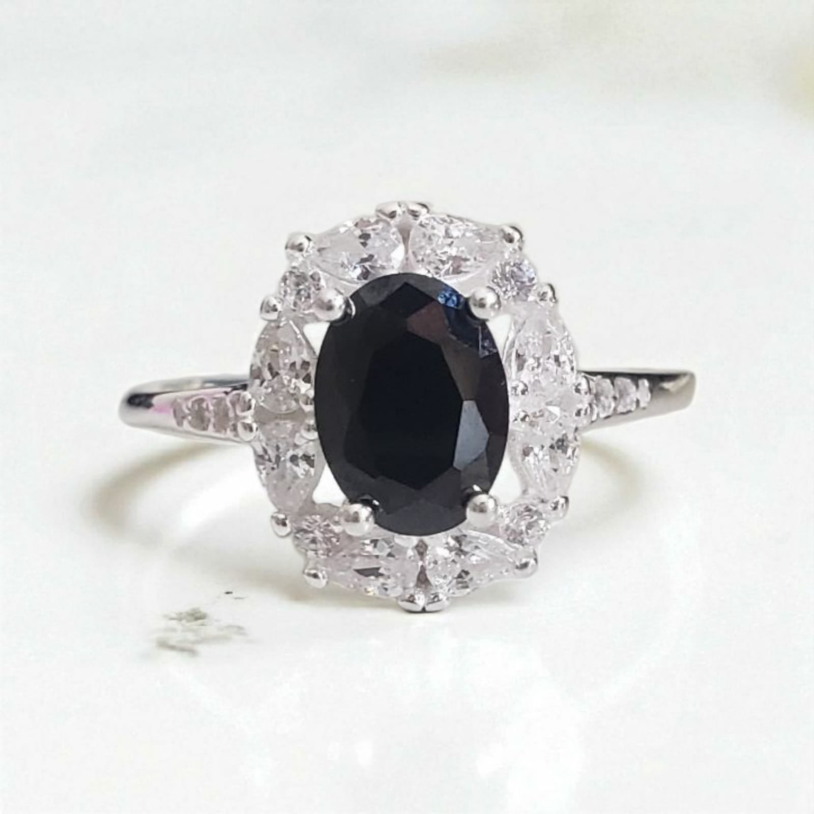 Su piedra central negra simboliza el misterio y la fortaleza, rodeada por un halo de cristales brillantes que realzan su luz cautivadora.